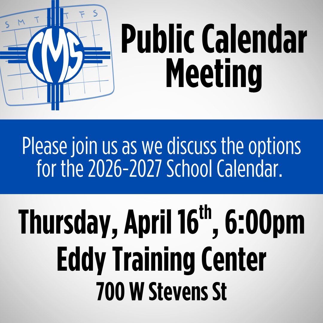 Public Calendar Meeting Please join us as we discuss the options for the 2026-2027 School CalendarThursday, April 16th6:00 PMEddy Training Center700 W Stevens St