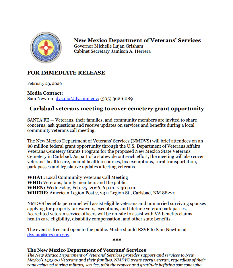 SANTA FE — Veterans, their families, and community members are invited to share concerns, ask questions and receive updates on services and benefits during a local community veterans call meeting.The New Mexico Department of Veterans’ Services (NMDVS) will brief attendees on an $8 million federal grant opportunity through the U.S. Department of Veterans Affairs Veterans Cemetery Grants Program for the proposed New Mexico State Veterans Cemetery in Carlsbad. As part of a statewide outreach effort, the meeting will also cover veterans’ health care, mental health resources, tax exemptions, rural transportation, park passes and legislative updates affecting veterans.