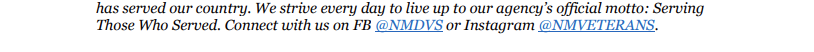The New Mexico Department of Veterans’ Services provides support and services to New Mexico’s 143,000 Veterans and their families. NMDVS treats every veteran, regardless of their rank achieved during military service, with the respect and gratitude befitting someone who has served our country. We strive every day to live up to our agency’s official motto: Serving Those Who Served. Connect with us on FB @NMDVS or Instagram @NMVETERANS.